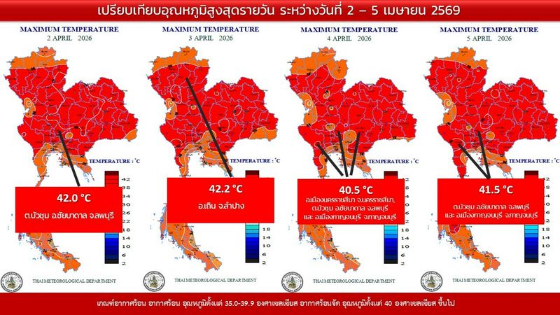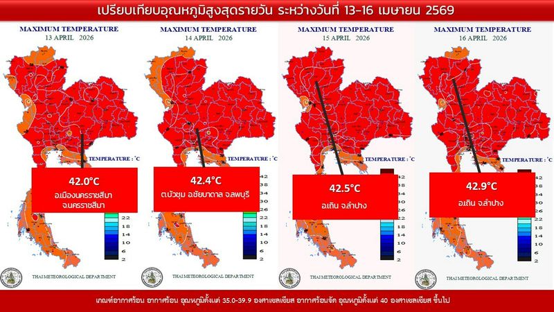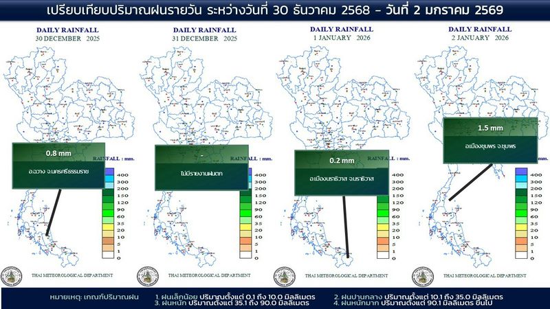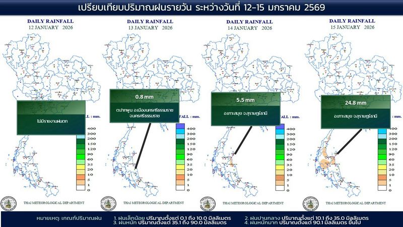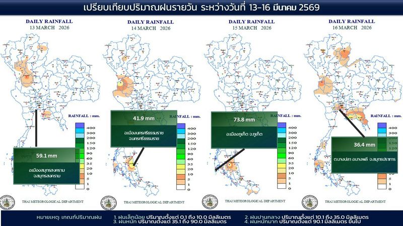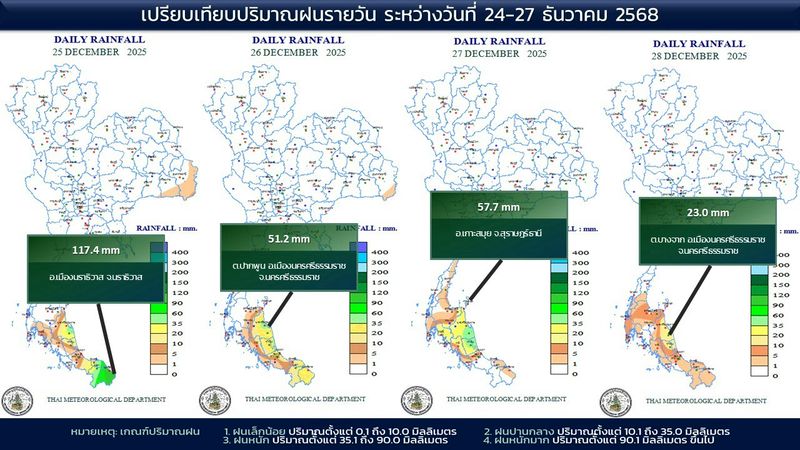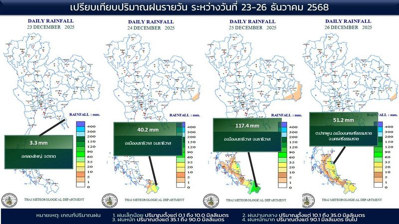 - 07:00 แผนที่เปรียบเทียบพื้นที่ที่มีปริมาณฝนสูงสุดในประเทศไทยรอบ 24 ชั่วโมงย้อนหลัง 4 วัน