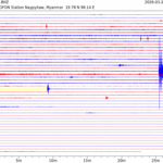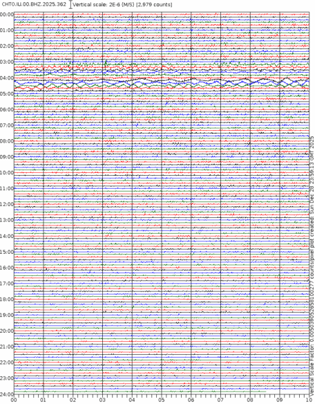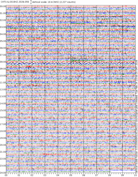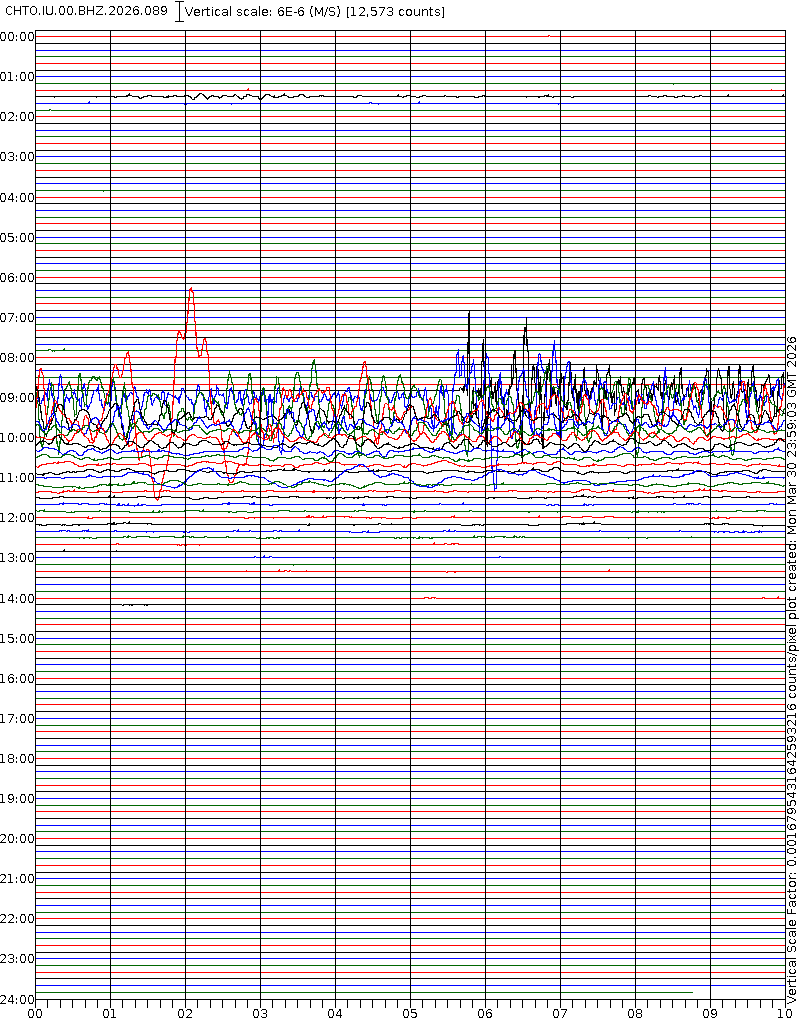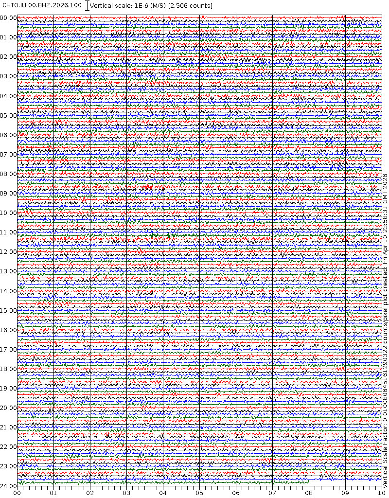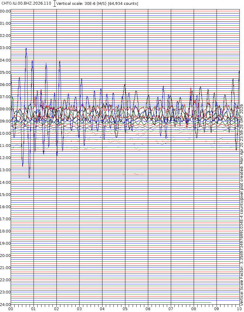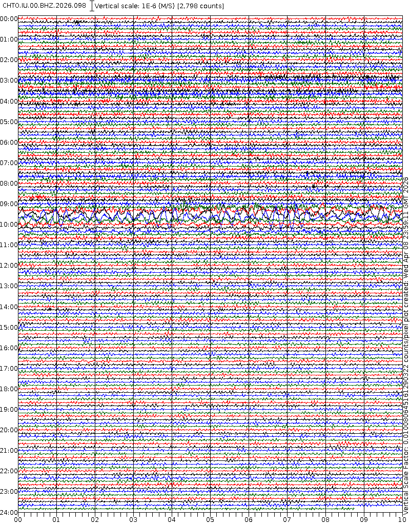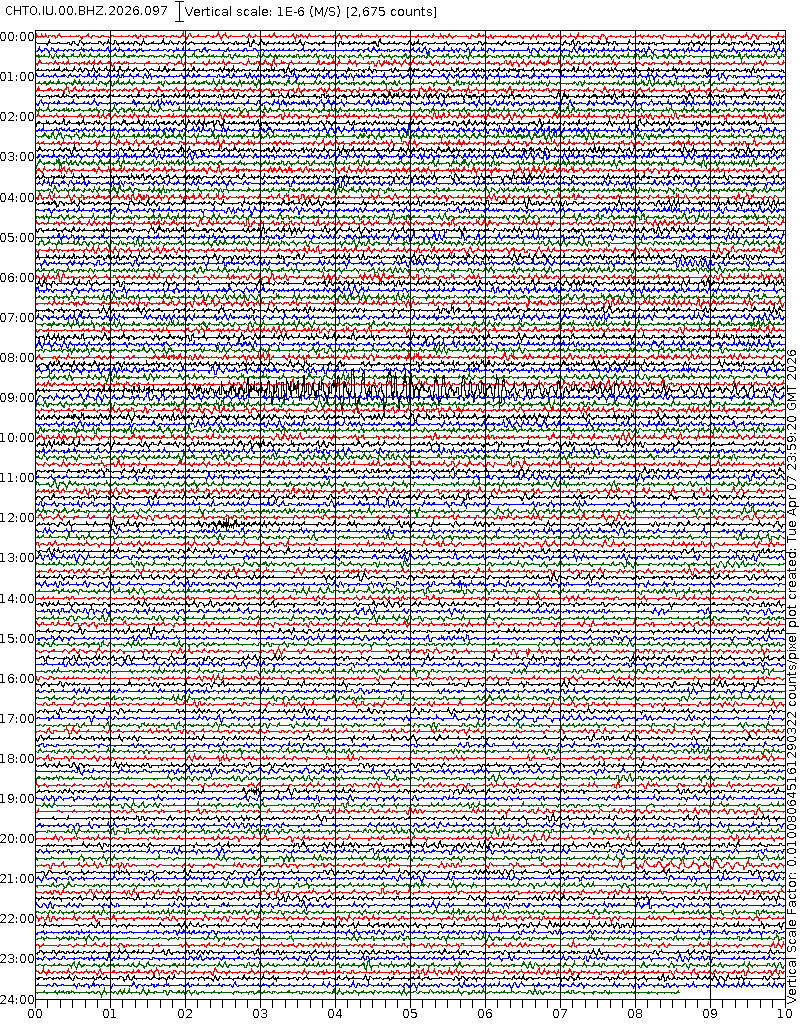 - 06:58 กราฟแผ่นดินไหวชนิดที่ใช้ดูเวลาเกิดเหตุเป็นหลัก แสดงภาพตามแนวตั้ง (BHZ) จากสถานีเครือข่าย IRIS สาขาเชียงใหม่ (CHTO) จาก 07:00 เช้าเมื่อวานนี้จนถึงเวลานี้ เส้นกราฟตามแนวนอนเส้นละ 10 นาที แยกสีเส้นกราฟเพื่อให้ดูได้ง่าย ช่องแบ่งตามแนวตั้งช่องละ 1 นาที