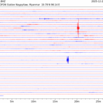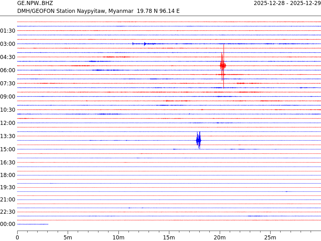 - 07:03 กราฟแผ่นดินไหว ช่วง 24 ชั่วโมงที่ผ่านมา บันทึกจากสถานีกรุงเนปิดอว์ ประเทศพม่า (กราฟนี้เน้นใช้ประโยชน์เรื่องของเวลาที่เกิดแผ่นดินไหว โดยแยกสีเป็นแดงน้ำเงินสีละครึ่งชั่วโมงเพื่อให้ดูง่าย ส่วนเรื่องขนาดแผ่นดินไหว กราฟนี้ไม่อาจใช้ระบุตัวเลขที่ชัดเจน)
