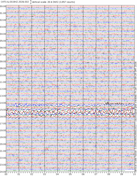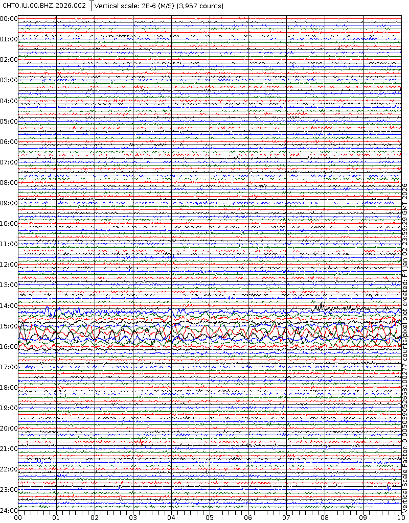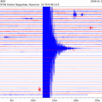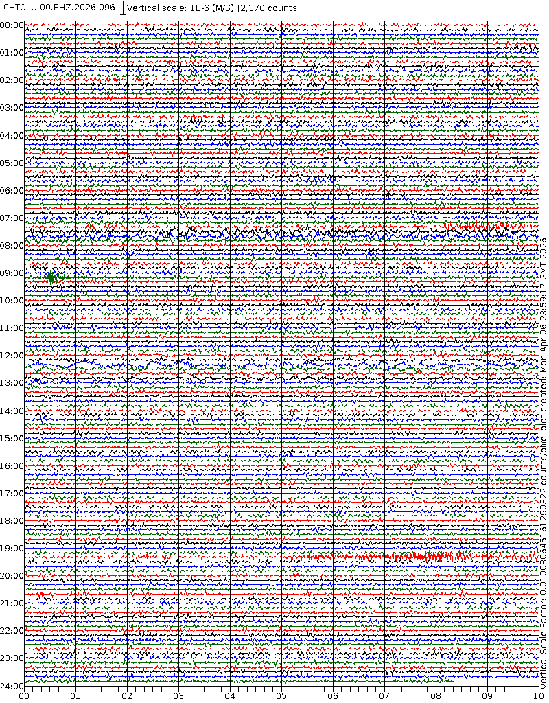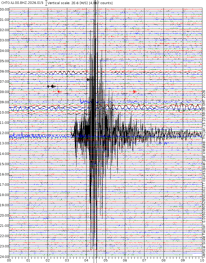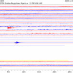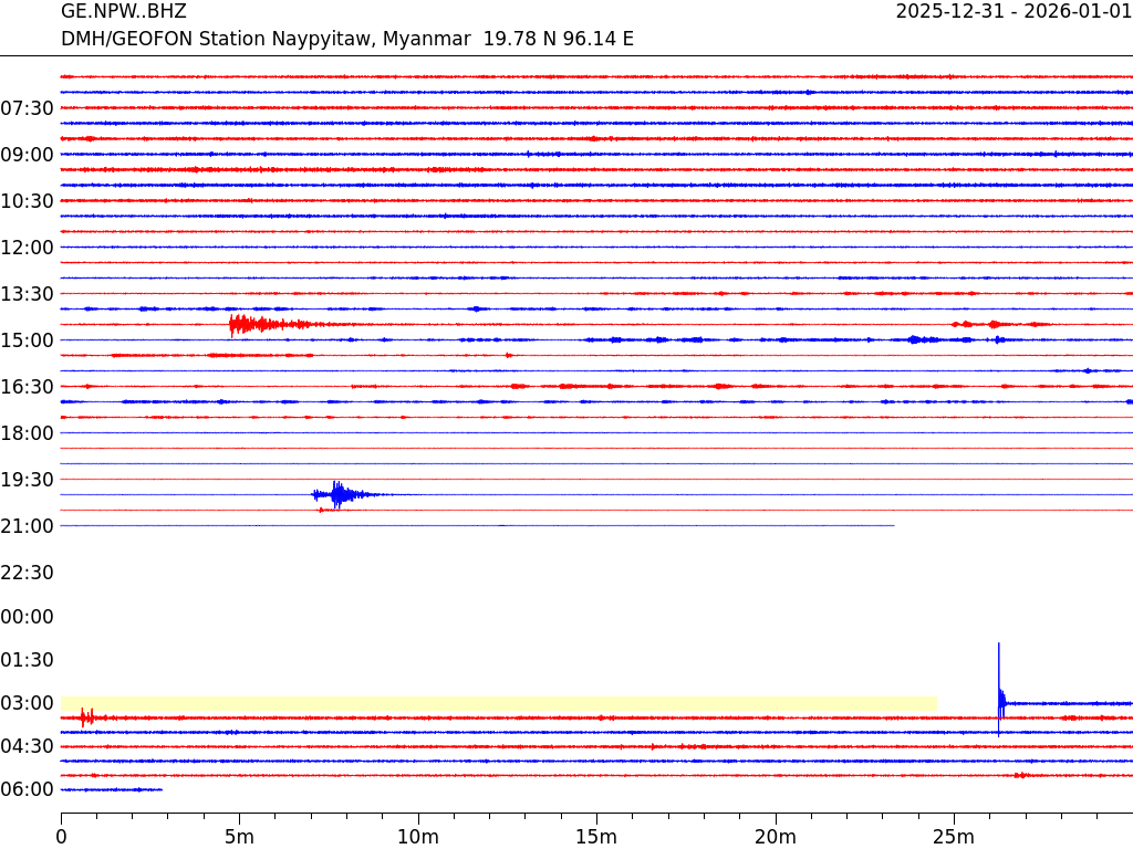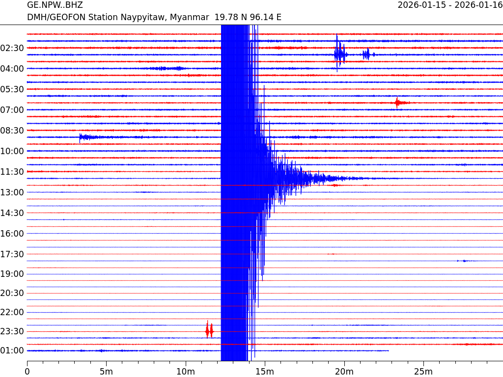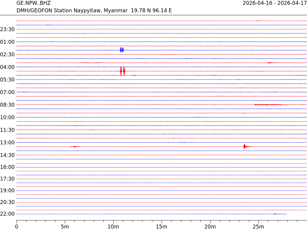 - 06:45 กราฟแผ่นดินไหว ช่วง 24 ชั่วโมงที่ผ่านมา บันทึกจากสถานีกรุงเนปิดอว์ ประเทศพม่า (กราฟนี้เน้นใช้ประโยชน์เรื่องของเวลาที่เกิดแผ่นดินไหว โดยแยกสีเป็นแดงน้ำเงินสีละครึ่งชั่วโมงเพื่อให้ดูง่าย ส่วนเรื่องขนาดแผ่นดินไหว กราฟนี้ไม่อาจใช้ระบุตัวเลขที่ชัดเจน)