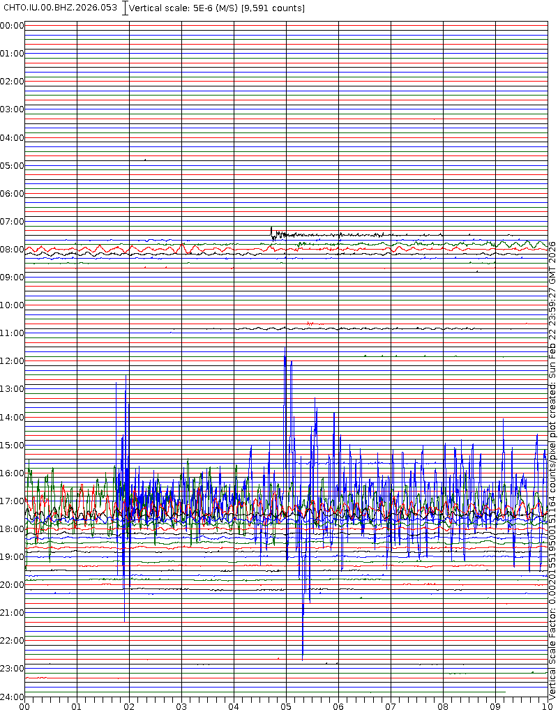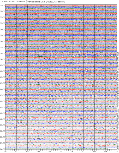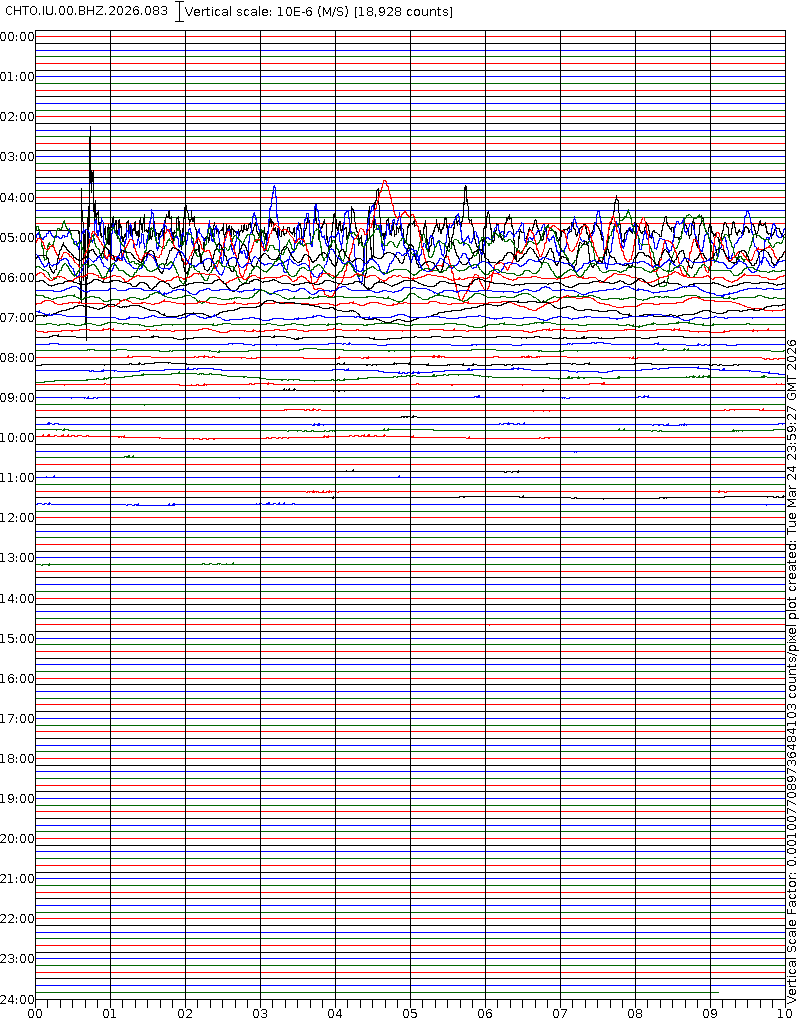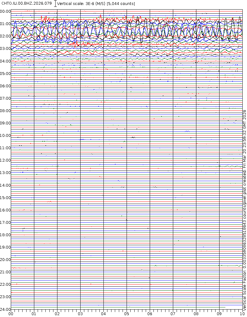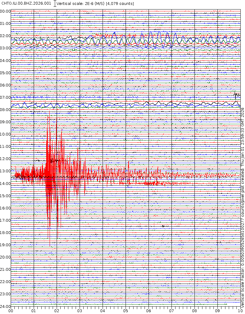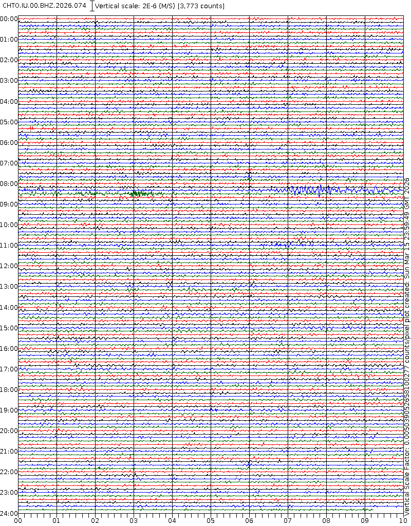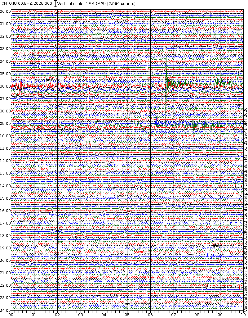 - 06:59 กราฟแผ่นดินไหวชนิดที่ใช้ดูเวลาเกิดเหตุเป็นหลัก แสดงภาพตามแนวตั้ง (BHZ) จากสถานีเครือข่าย IRIS สาขาเชียงใหม่ (CHTO) จาก 07:00 เช้าเมื่อวานนี้จนถึงเวลานี้ เส้นกราฟตามแนวนอนเส้นละ 10 นาที แยกสีเส้นกราฟเพื่อให้ดูได้ง่าย ช่องแบ่งตามแนวตั้งช่องละ 1 นาที
