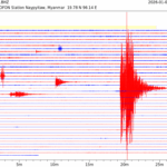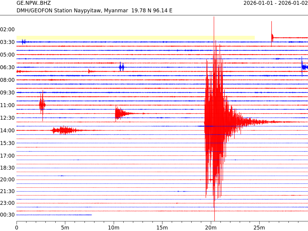 - 07:37 กราฟแผ่นดินไหว ช่วง 24 ชั่วโมงที่ผ่านมา บันทึกจากสถานีกรุงเนปิดอว์ ประเทศพม่า (กราฟนี้เน้นใช้ประโยชน์เรื่องของเวลาที่เกิดแผ่นดินไหว โดยแยกสีเป็นแดงน้ำเงินสีละครึ่งชั่วโมงเพื่อให้ดูง่าย ส่วนเรื่องขนาดแผ่นดินไหว กราฟนี้ไม่อาจใช้ระบุตัวเลขที่ชัดเจน)