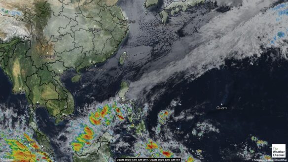 - 13:00 ภาพดาวเทียมย้อมสีจาก TWC แสดงกลุ่มฝนในเอเชียตะวันออกเฉียงใต้และโซนตะวันตกของมหาสมุทรแปซิฟิกเวลานี้