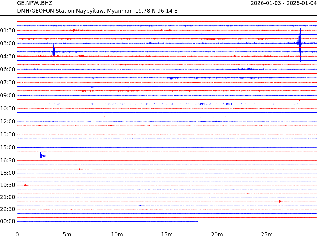 - 07:18 กราฟแผ่นดินไหว ช่วง 24 ชั่วโมงที่ผ่านมา บันทึกจากสถานีกรุงเนปิดอว์ ประเทศพม่า (กราฟนี้เน้นใช้ประโยชน์เรื่องของเวลาที่เกิดแผ่นดินไหว โดยแยกสีเป็นแดงน้ำเงินสีละครึ่งชั่วโมงเพื่อให้ดูง่าย ส่วนเรื่องขนาดแผ่นดินไหว กราฟนี้ไม่อาจใช้ระบุตัวเลขที่ชัดเจน)