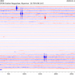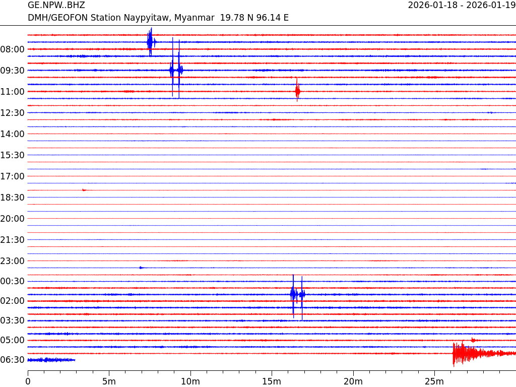 - 13:33 กราฟแผ่นดินไหว ช่วง 24 ชั่วโมงที่ผ่านมา บันทึกจากสถานีกรุงเนปิดอว์ ประเทศพม่า (กราฟนี้เน้นใช้ประโยชน์เรื่องของเวลาที่เกิดแผ่นดินไหว โดยแยกสีเป็นแดงน้ำเงินสีละครึ่งชั่วโมงเพื่อให้ดูง่าย ส่วนเรื่องขนาดแผ่นดิน