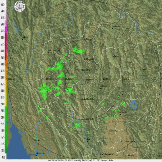 - 05:45 เรดาร์ตรวจอากาศ TMD แบบเคลื่อนไหว รัศมี 240 กม. ศูนย์กลางที่ จ.ลำพูน แสดงกลุ่มฝนตลอด 1 ชั่วโมง 15 นาที ที่ผ่านมา