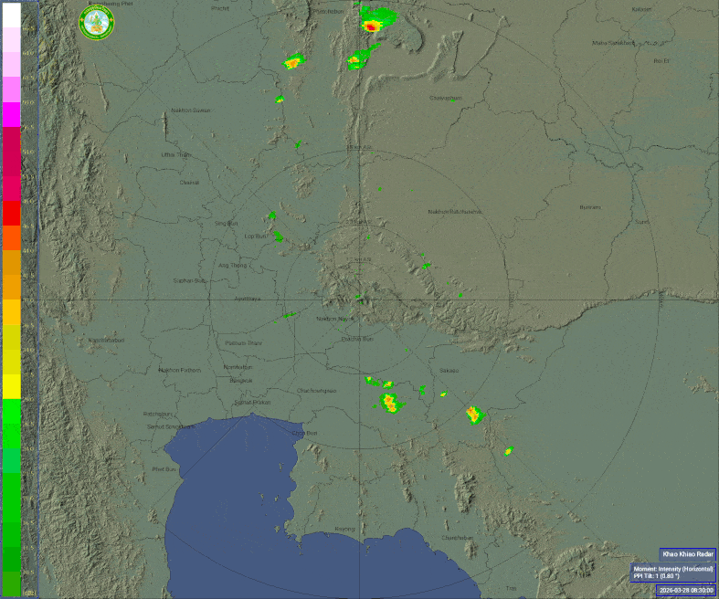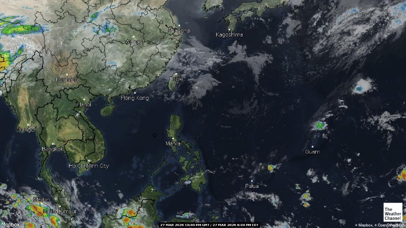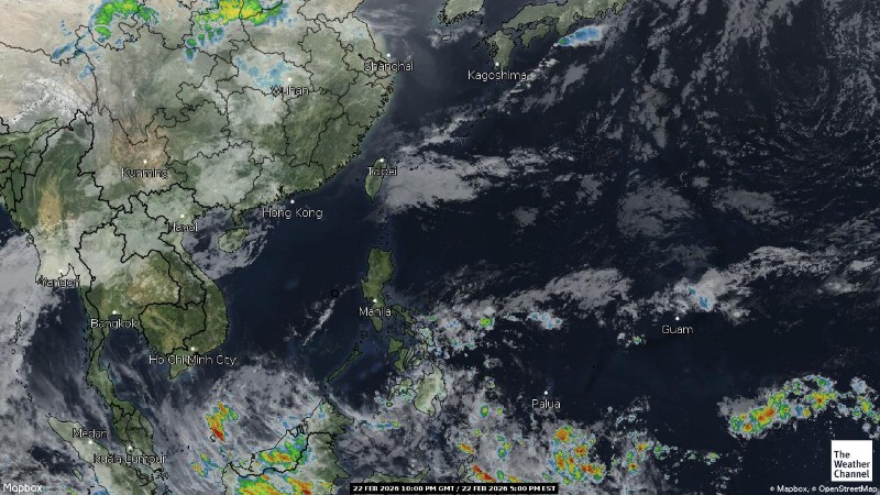 - 05:00 ภาพดาวเทียมย้อมสีจาก TWC แสดงกลุ่มฝนในเอเชียตะวันออกเฉียงใต้และโซนตะวันตกของมหาสมุทรแปซิฟิกเวลานี้