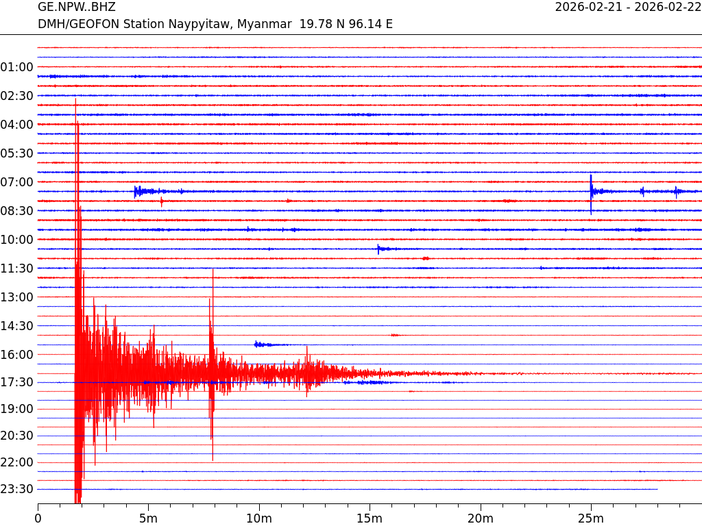 - 06:58 กราฟแผ่นดินไหว ช่วง 24 ชั่วโมงที่ผ่านมา บันทึกจากสถานีกรุงเนปิดอว์ ประเทศพม่า (กราฟนี้เน้นใช้ประโยชน์เรื่องของเวลาที่เกิดแผ่นดินไหว โดยแยกสีเป็นแดงน้ำเงินสีละครึ่งชั่วโมงเพื่อให้ดูง่าย ส่วนเรื่องขนาดแผ่นดินไหว กราฟนี้ไม่อาจใช้ระบุตัวเลขที่ชัดเจน)