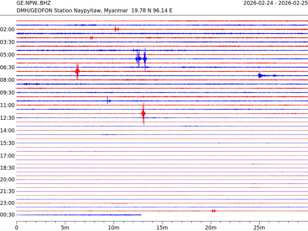 - 07:43 กราฟแผ่นดินไหว ช่วง 24 ชั่วโมงที่ผ่านมา บันทึกจากสถานีกรุงเนปิดอว์ ประเทศพม่า (กราฟนี้เน้นใช้ประโยชน์เรื่องของเวลาที่เกิดแผ่นดินไหว โดยแยกสีเป็นแดงน้ำเงินสีละครึ่งชั่วโมงเพื่อให้ดูง่าย ส่วนเรื่องขนาดแผ่นดินไหว กราฟนี้ไม่อาจใช้ระบุตัวเลขที่ชัดเจน)