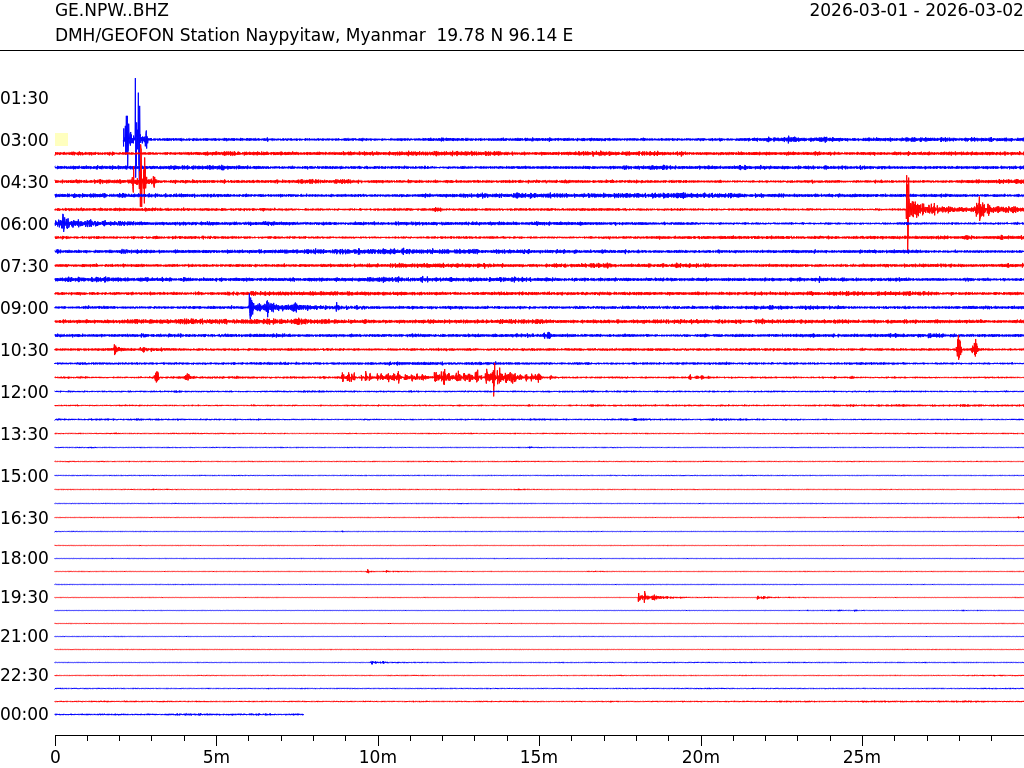 - 07:07 กราฟแผ่นดินไหว ช่วง 24 ชั่วโมงที่ผ่านมา บันทึกจากสถานีกรุงเนปิดอว์ ประเทศพม่า (กราฟนี้เน้นใช้ประโยชน์เรื่องของเวลาที่เกิดแผ่นดินไหว โดยแยกสีเป็นแดงน้ำเงินสีละครึ่งชั่วโมงเพื่อให้ดูง่าย ส่วนเรื่องขนาดแผ่นดินไหว กราฟนี้ไม่อาจใช้ระบุตัวเลขที่ชัดเจน)