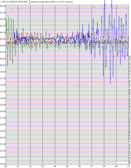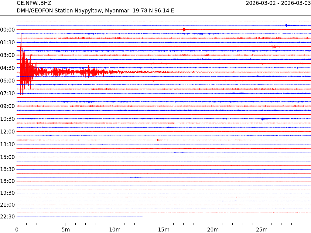 - 05:42 กราฟแผ่นดินไหว ช่วง 24 ชั่วโมงที่ผ่านมา บันทึกจากสถานีกรุงเนปิดอว์ ประเทศพม่า (กราฟนี้เน้นใช้ประโยชน์เรื่องของเวลาที่เกิดแผ่นดินไหว โดยแยกสีเป็นแดงน้ำเงินสีละครึ่งชั่วโมงเพื่อให้ดูง่าย ส่วนเรื่องขนาดแผ่นดินไหว กราฟนี้ไม่อาจใช้ระบุตัวเลขที่ชัดเจน)