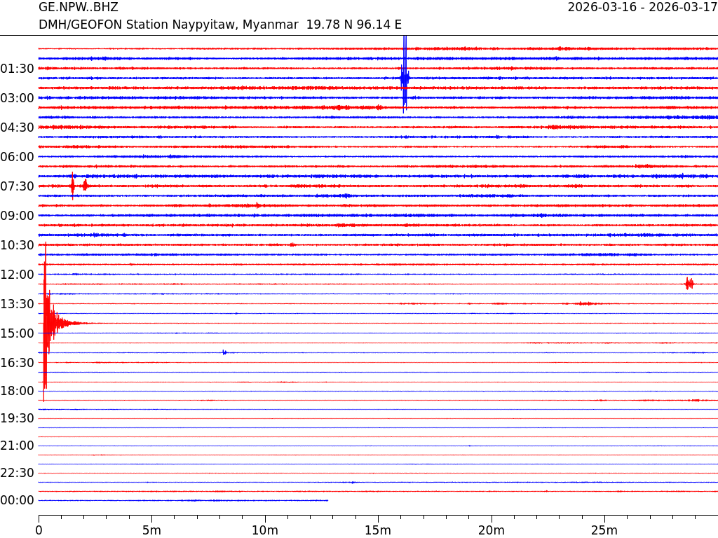 - 07:12 กราฟแผ่นดินไหว ช่วง 24 ชั่วโมงที่ผ่านมา บันทึกจากสถานีกรุงเนปิดอว์ ประเทศพม่า (กราฟนี้เน้นใช้ประโยชน์เรื่องของเวลาที่เกิดแผ่นดินไหว โดยแยกสีเป็นแดงน้ำเงินสีละครึ่งชั่วโมงเพื่อให้ดูง่าย ส่วนเรื่องขนาดแผ่นดินไหว กราฟนี้ไม่อาจใช้ระบุตัวเลขที่ชัดเจน)