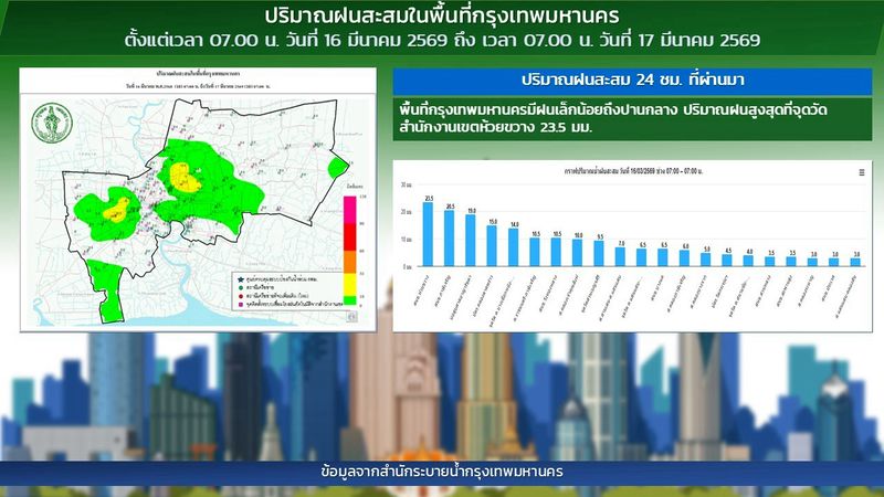 - 07:00 แผนที่แสดงบริเวณและปริมาณฝนตกในเขตกรุงเทพฯ รอบ 24 ชั่วโมงที่ผ่านมา โดย สำนักระบายน้ำ กทม.