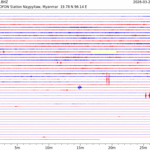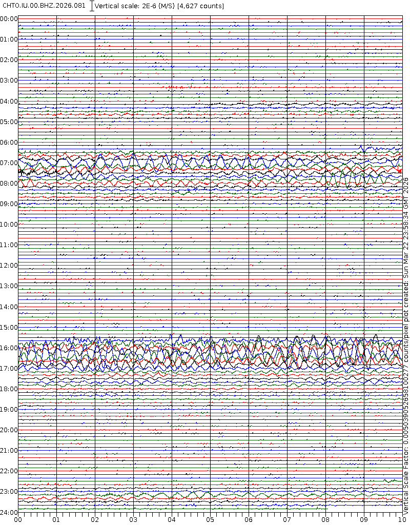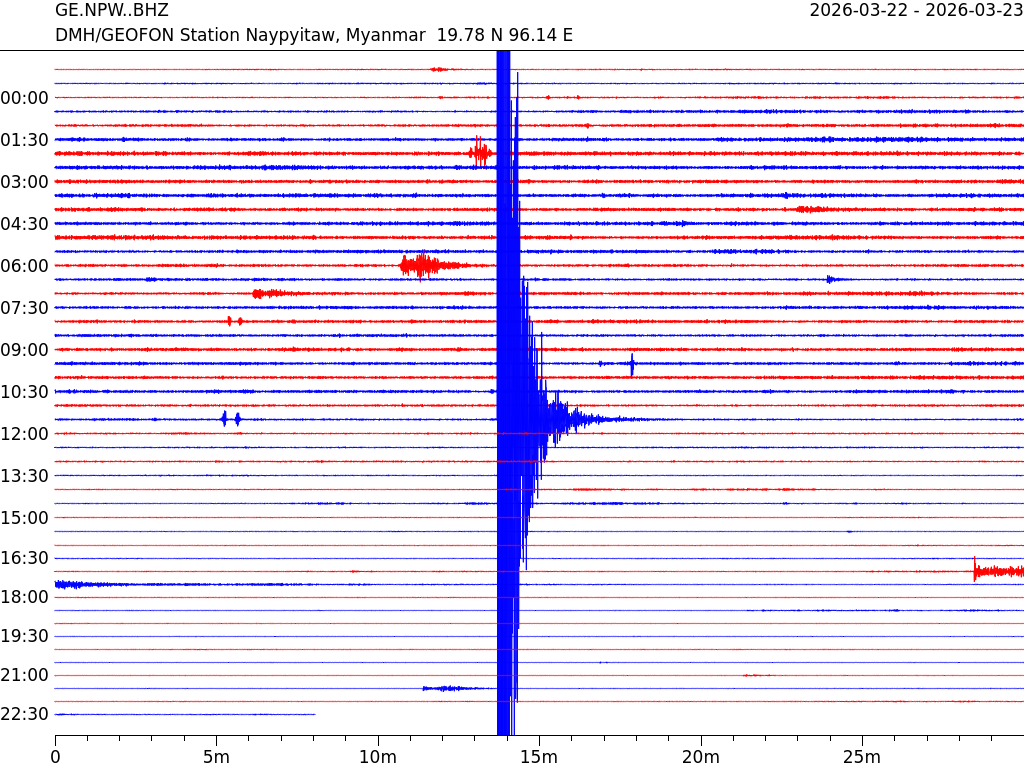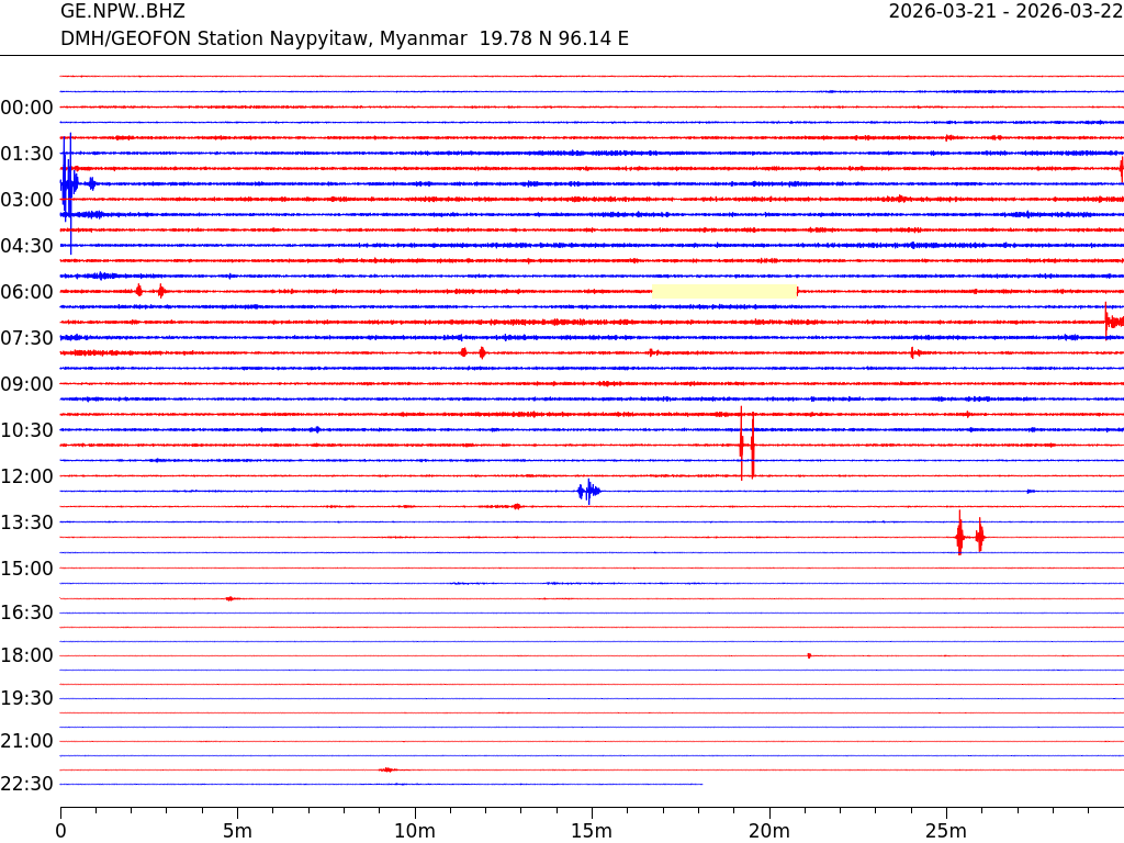 - 05:38 กราฟแผ่นดินไหว ช่วง 24 ชั่วโมงที่ผ่านมา บันทึกจากสถานีกรุงเนปิดอว์ ประเทศพม่า (กราฟนี้เน้นใช้ประโยชน์เรื่องของเวลาที่เกิดแผ่นดินไหว โดยแยกสีเป็นแดงน้ำเงินสีละครึ่งชั่วโมงเพื่อให้ดูง่าย ส่วนเรื่องขนาดแผ่นดินไหว กราฟนี้ไม่อาจใช้ระบุตัวเลขที่ชัดเจน)