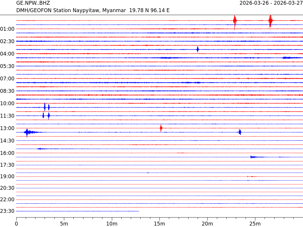 - 06:42 กราฟแผ่นดินไหว ช่วง 24 ชั่วโมงที่ผ่านมา บันทึกจากสถานีกรุงเนปิดอว์ ประเทศพม่า (กราฟนี้เน้นใช้ประโยชน์เรื่องของเวลาที่เกิดแผ่นดินไหว โดยแยกสีเป็นแดงน้ำเงินสีละครึ่งชั่วโมงเพื่อให้ดูง่าย ส่วนเรื่องขนาดแผ่นดินไหว กราฟนี้ไม่อาจใช้ระบุตัวเลขที่ชัดเจน)