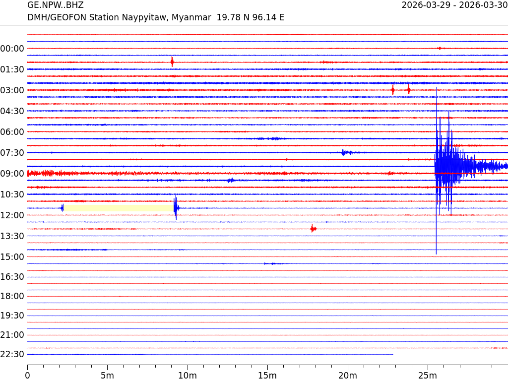 - 05:52 กราฟแผ่นดินไหว ช่วง 24 ชั่วโมงที่ผ่านมา บันทึกจากสถานีกรุงเนปิดอว์ ประเทศพม่า (กราฟนี้เน้นใช้ประโยชน์เรื่องของเวลาที่เกิดแผ่นดินไหว โดยแยกสีเป็นแดงน้ำเงินสีละครึ่งชั่วโมงเพื่อให้ดูง่าย ส่วนเรื่องขนาดแผ่นดินไหว กราฟนี้ไม่อาจใช้ระบุตัวเลขที่ชัดเจน)