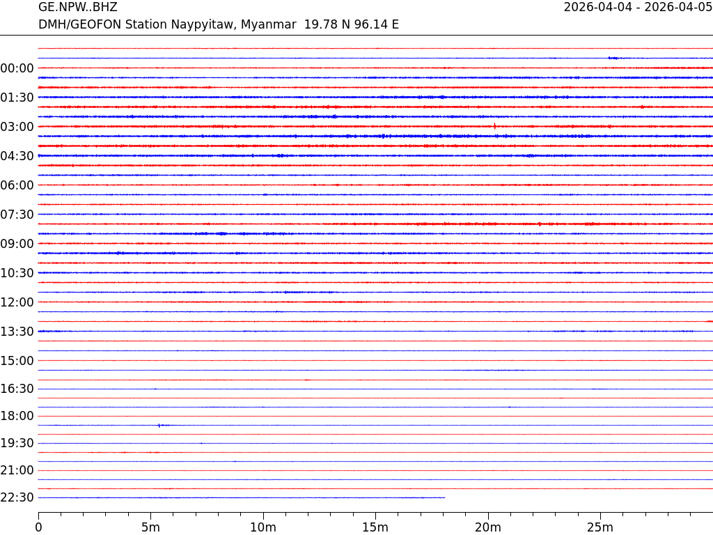 - 05:48 กราฟแผ่นดินไหว ช่วง 24 ชั่วโมงที่ผ่านมา บันทึกจากสถานีกรุงเนปิดอว์ ประเทศพม่า (กราฟนี้เน้นใช้ประโยชน์เรื่องของเวลาที่เกิดแผ่นดินไหว โดยแยกสีเป็นแดงน้ำเงินสีละครึ่งชั่วโมงเพื่อให้ดูง่าย ส่วนเรื่องขนาดแผ่นดินไหว กราฟนี้ไม่อาจใช้ระบุตัวเลขที่ชัดเจน)