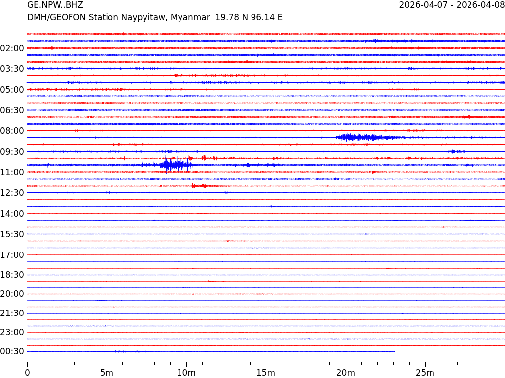 - 07:53 กราฟแผ่นดินไหว ช่วง 24 ชั่วโมงที่ผ่านมา บันทึกจากสถานีกรุงเนปิดอว์ ประเทศพม่า (กราฟนี้เน้นใช้ประโยชน์เรื่องของเวลาที่เกิดแผ่นดินไหว โดยแยกสีเป็นแดงน้ำเงินสีละครึ่งชั่วโมงเพื่อให้ดูง่าย ส่วนเรื่องขนาดแผ่นดินไหว กราฟนี้ไม่อาจใช้ระบุตัวเลขที่ชัดเจน)