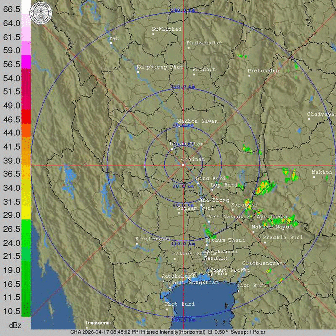 - 17:00 เรดาร์ตรวจอากาศ TMD แบบเคลื่อนไหว รัศมี 240 กม. ศูนย์กลางที่ จ.ชัยนาทแสดงกลุ่มฝนตลอด 1 ชั่วโมง 15 นาที ที่ผ่านมา