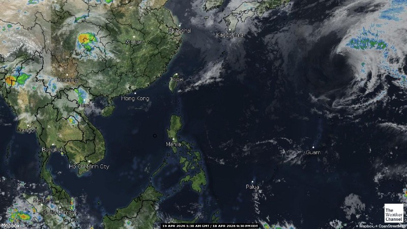 - 05:30 ภาพดาวเทียมย้อมสีจาก TWC แสดงกลุ่มฝนในเอเชียตะวันออกเฉียงใต้และโซนตะวันตกของมหาสมุทรแปซิฟิกเวลานี้