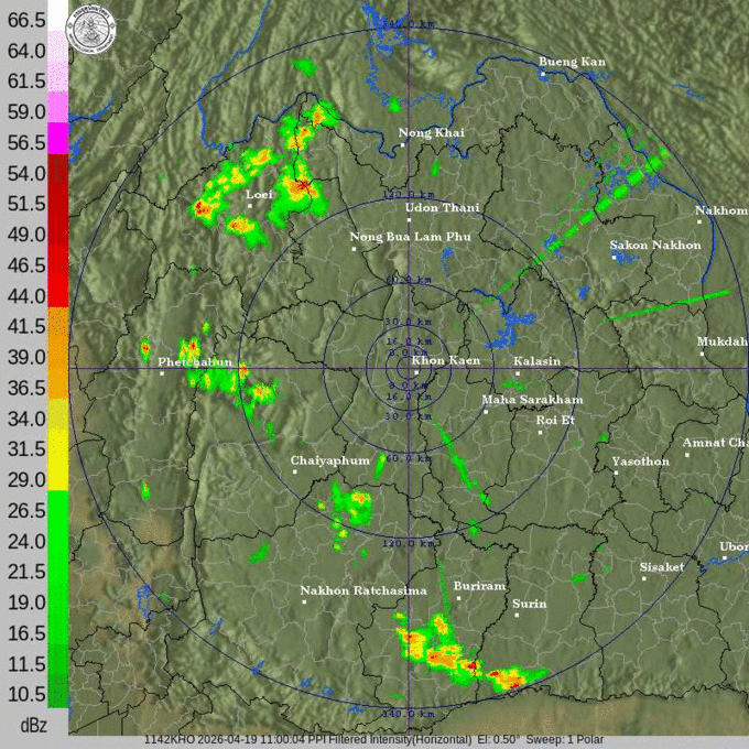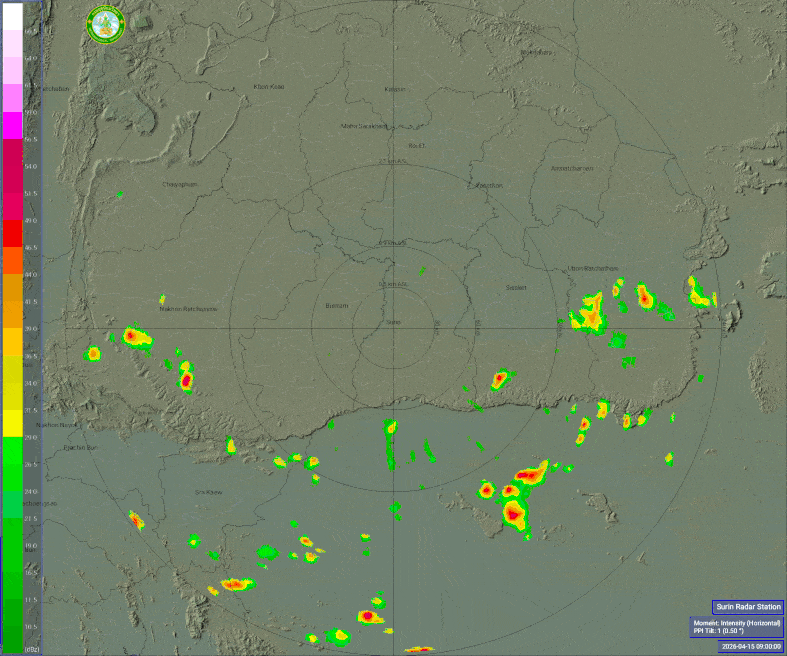 - 14:00 เรดาร์ตรวจอากาศ TMD แบบเคลื่อนไหว รัศมี 240 กม. ศูนย์กลางที่ จ.นครนายก แสดงกลุ่มฝนตลอด 1 ชั่วโมง 15 นาที ที่ผ่านมา