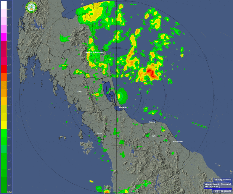 - 05:30 เรดาร์ตรวจอากาศ TMD แบบเคลื่อนไหว รัศมี 240 กม. ศูนย์กลางที่ สทิงพระ แสดงกลุ่มฝนตลอด 1 ชั่วโมง 15 นาที ที่ผ่านมา