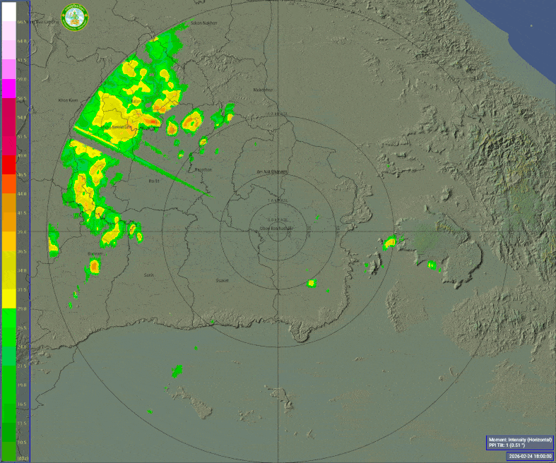 - 05:00 เรดาร์ตรวจอากาศ TMD แบบเคลื่อนไหว รัศมี 240 กม. ศูนย์กลางที่ อุบลราชธานี แสดงกลุ่มฝนตลอด 4 ชั่วโมงที่ผ่านมา