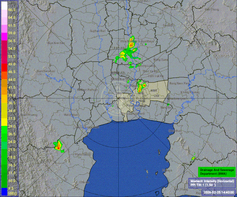 - 15:35 เรดาร์ตรวจฝนจากสำนักการระบายน้ำ กทม ที่หนองแขม (แบบเคลื่อนไหว) แสดงกลุ่มฝนที่ตกในกรุงเทพฯและปริมณฑลรวมทั้งบางจังหวัดในภาคกลางตอนล่างและภาคตะวันออกตลอด 55 นาทีที่ผ่านมา
