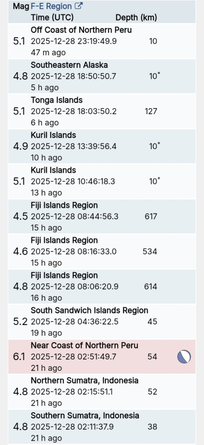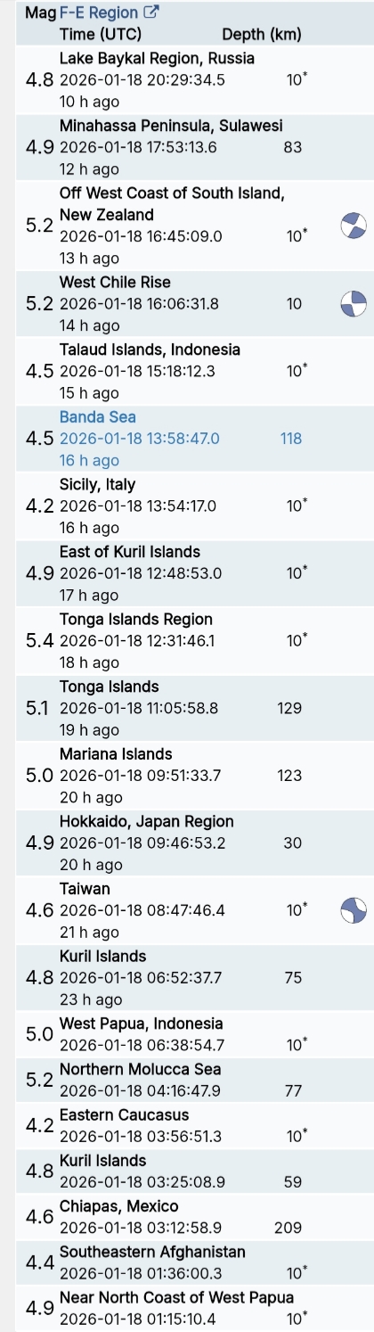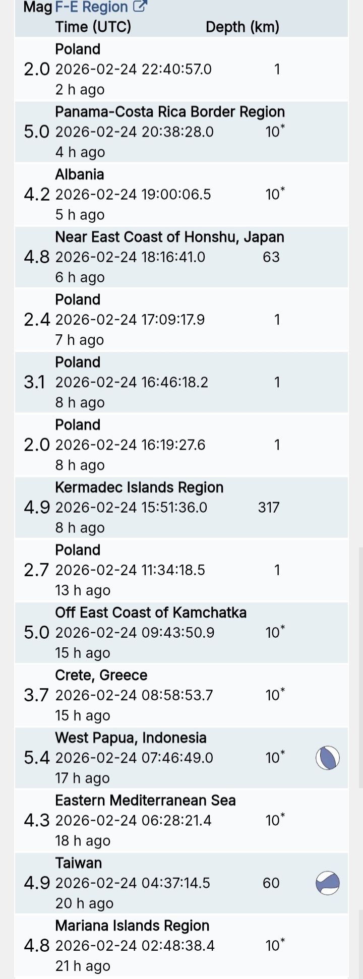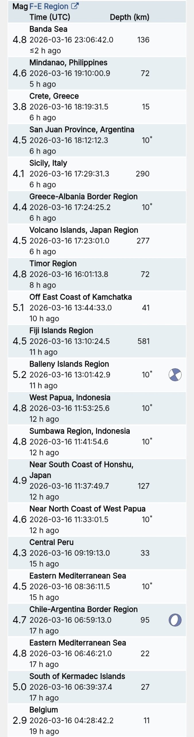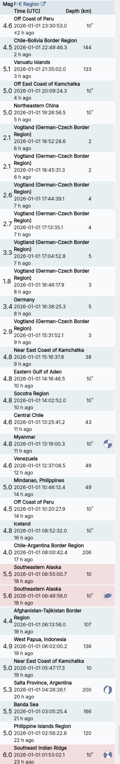 สรุปรายการแผ่นดินไหวและอาฟเตอร์ช็อกทั่วโลกจาก Geofon เยอรมนี ช่วง 07:00 เมื่อวานนี้ ถึง 07:00 เช้าวันนี้ (เวลาในตารางเป็น UTC ต้องบวก 7 ชั่วโมงให้เป็นเวลาไทย)