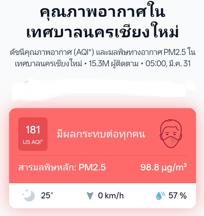 - 05:00 เทศบาลนครเชียงใหม่ สภาพฝุ่น PM2.5 98.8 µg/m³