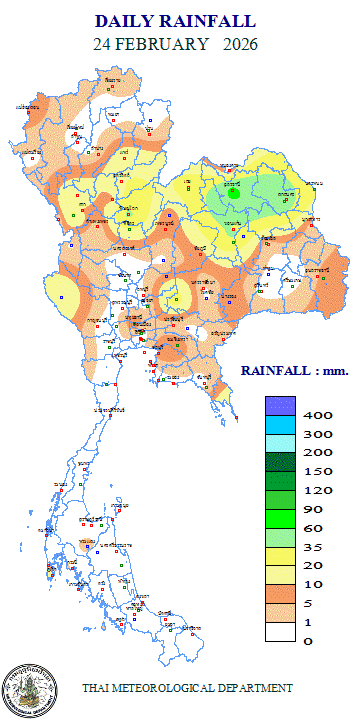 - 07:00 แผนที่แสดงบริเวณและปริมาณฝนที่ตกในประเทศไทยระหว่าง 24 ชั่วโมงที่ผ่านมา