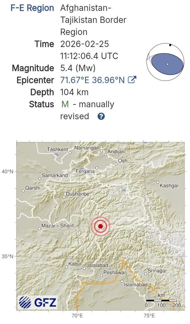 - 18:12 แผ่นดินไหวขนาด 5.4 (Mw) ลึก 104 กม.พิกัด 71.67°E 36.96°N จังหวัดบาดัคชาน ประเทศอัฟกานิสถาน