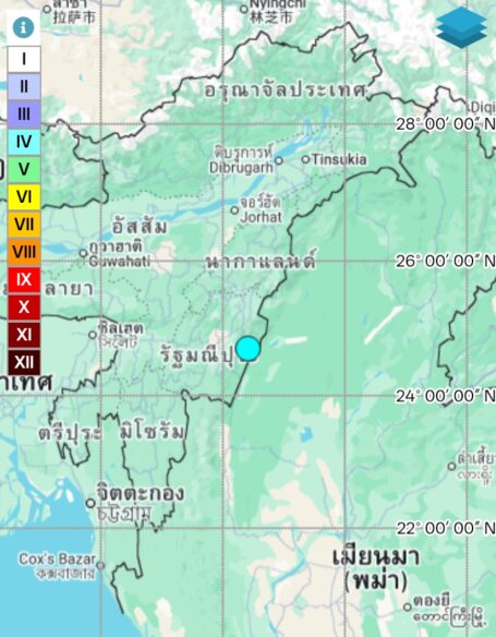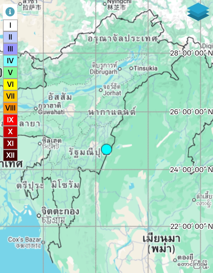 - 07:29 แผ่นดินไหวขนาด 5.2 ลึก 62 กม.พิกัด 24.703°N 94.415°E รัฐมณีปุระ ประเทศอินเดีย