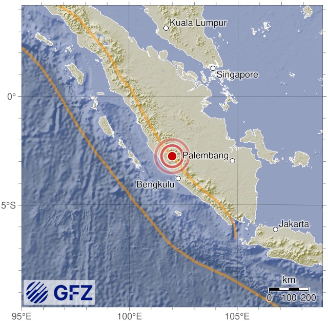 - 18:02 แผ่นดินไหวขนาด 5.0 (mb) ลึก 156 กม.พิกัด 101.98°E 2.77°S จังหวัดเบงกูลู เกาะสุมาตรา ประเทศอินโดนีเซีย