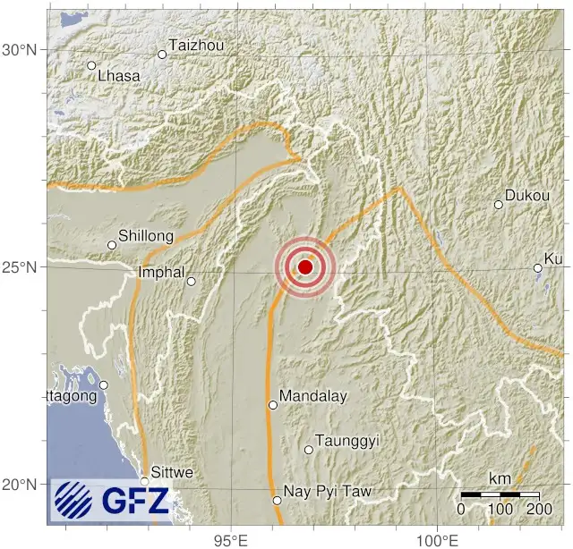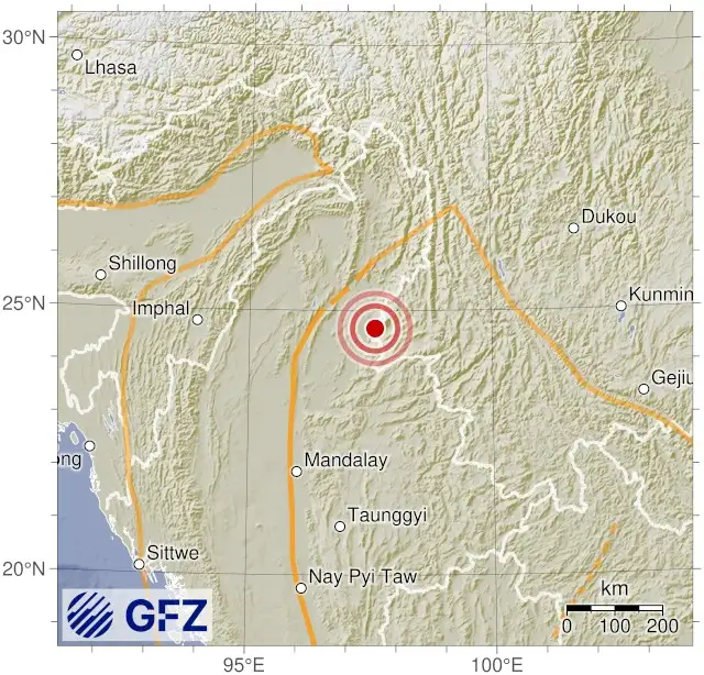 - 13:00 แผ่นดินไหวขนาด 4.4 (mb) ลึก 10 กม.พิกัด 96.80°E 25.14°N รัฐกะฉิ่น ใกล้รอยต่อรัฐสะกาย ประเทศพม่า