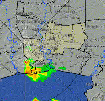 - 08:05 เรดาร์ตรวจฝนจากสำนักการระบายน้ำ กทม ที่หนองแขม (แบบเคลื่อนไหว) แสดงกลุ่มฝนที่ตกในกรุงเทพฯและปริมณฑลรวมทั้งบางจังหวัดในภาคกลางตอนล่างและภาคตะวันออกตลอด 55 นาทีที่ผ่านมา